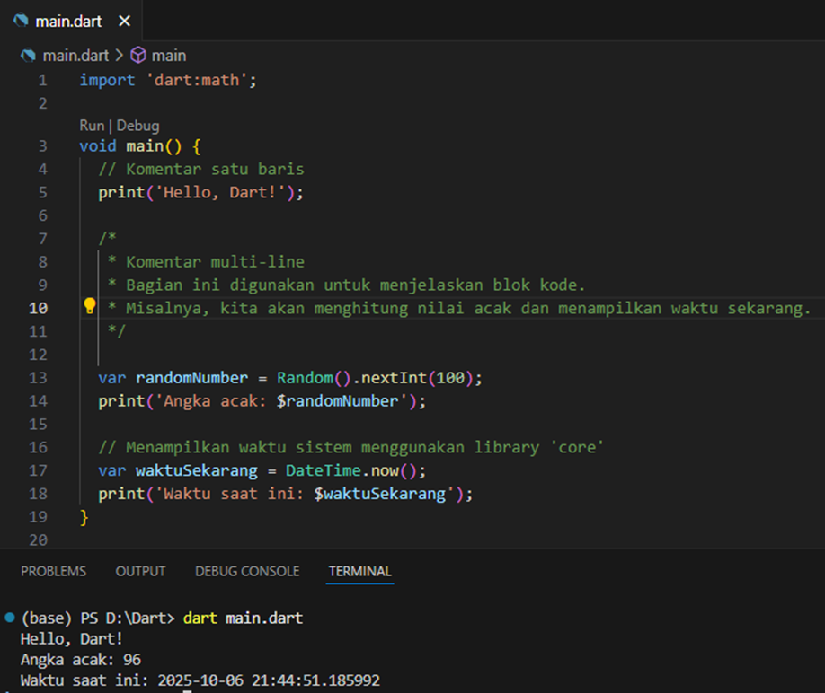 Komentar dapat digunakan untuk menjelaskan kode Dart, dan membuat program lebih mudah dibaca.