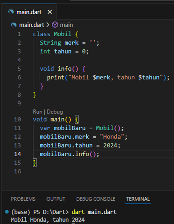 Kelas menyediakan nilai awal untuk atribut (state) dan implementasi perilaku (behavior).