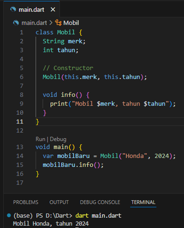 Fungsi khusus di dalam class yang otomatis dijalankan ketika objek dibuat. Fungsi Constructor adalah Untuk menginisialisasi nilai awal pada saat objek dibuat. Sebagai perbandingan, lihat source code berikut:
