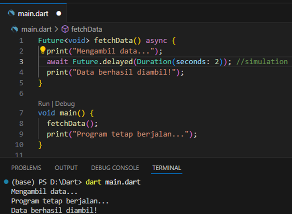 Await digunakan di dalam fungsi async untuk menunggu hasil dari operasi asynchronous sebelum melanjutkan ke baris berikutnya. Contoh:
