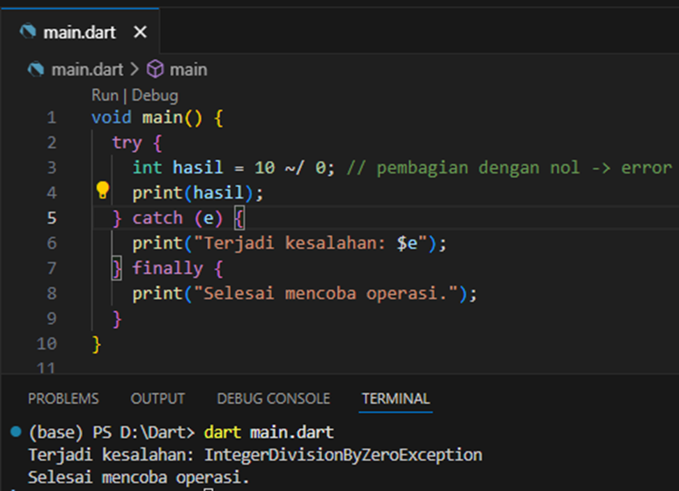 • finally → dijalankan selalu, meskipun terjadi error atau tidak.
