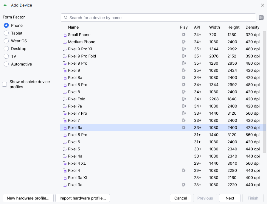 Pilih virtual device yang kita butuhkan sesuai dengan target API yang dibutuhkan, selanjutnya Next dan Finish.
